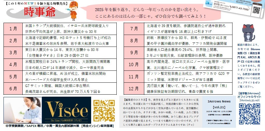 今お配りしている当塾の広報紙『3ArrowsNews』の最新号には、2025年の出来事をキーワードで振り返るコーナー"時事爺"を載せています。