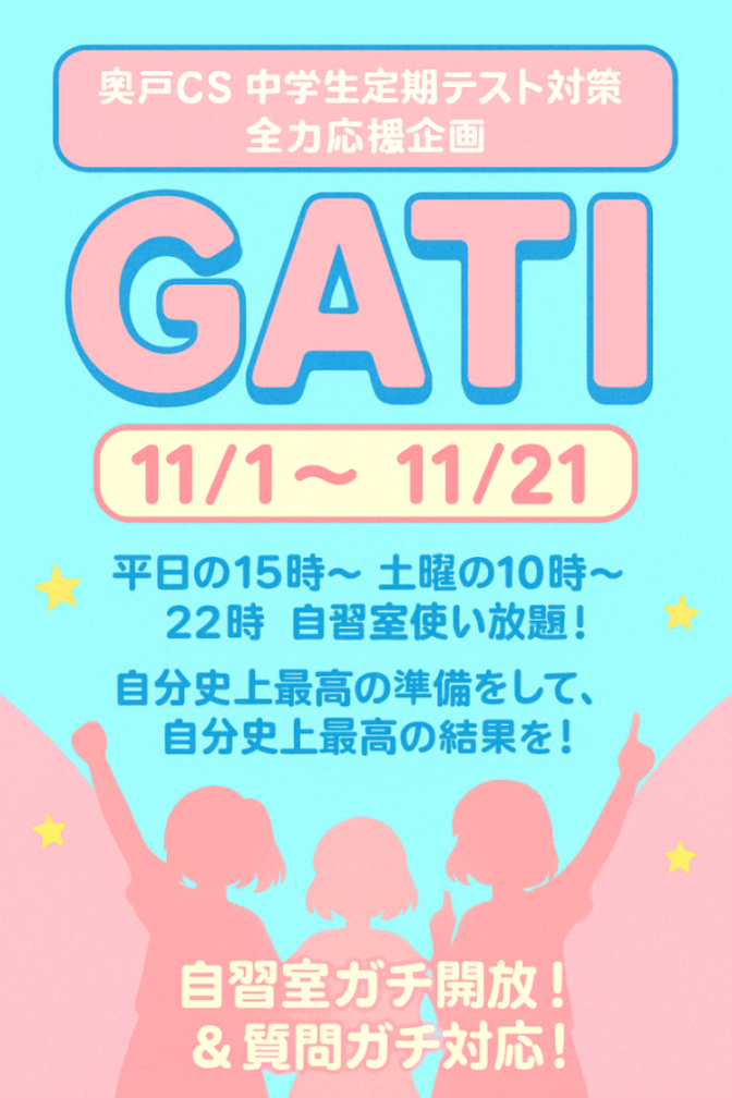 3Arrows奥戸CSの中学生定期考査対策応援企画がGATI(ガティ)という名称なのです。